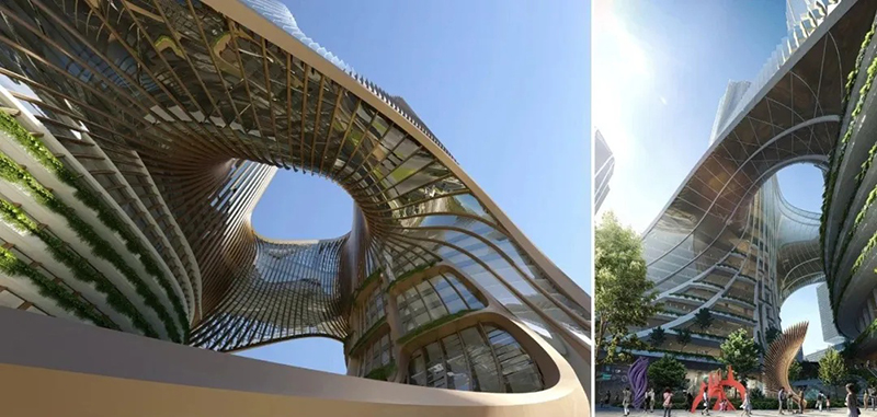 扎哈事務(wù)所的設(shè)計(jì)旨在創(chuàng)造一個(gè)新的地標(biāo),一組新的可識別的塔,讓建筑本身成為一個(gè)公共事件。方案完美地回應(yīng)了深超總城市規(guī)劃設(shè)計(jì)的“十字生境”理念,并與周邊的公園和廣場建立了直接的聯(lián)通關(guān)系——裙房梯田狀的空間形態(tài)將中央綠軸自然地引入裙房公共空間,提供直接的連續(xù)感,并通過塔樓設(shè)計(jì)使該空間不斷上升,使建筑整體與綠軸景觀無縫連接。