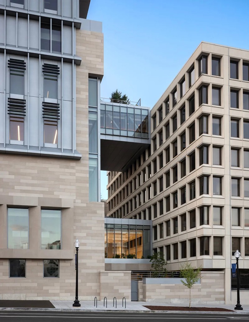 羅伯特-A-M-斯特恩建筑設計事務所(RAMSA)為位于華盛頓市中心喬治敦大學國會大廈校區的麥考特公共政策學院設計了一座新的旗艦建筑。這座新建筑占地 150,000 平方英尺,位于西北部 125 E 街,是學生、教師、研究人員以及活躍在美國首都的廣大決策社區的學術中心。大樓內有大量的教育和社區空間,包括 20 間教室、一個寬敞的主公共空間、學術辦公室、一個可容納 400 人的禮堂,以及一個可俯瞰美國國會大廈全景的大型屋頂露臺和一個可容納 280 人的會場。作為一個致力于應對復雜的國家和國際挑戰的學術中心,麥考特公共政策學院將可持續發展和能源效率放在首位,其設計目標是獲得 LEED 白金級認證。此外,由建筑師、設計師、藝術家和雕塑家瑪雅-林(Maya Lin)設計的一系列針對特定場所的原創裝置,鼓勵建筑使用者考慮周圍的自然環境。作為國會大廈校區的旗艦建筑,麥考特學校是喬治城市中心文脈和連貫性的延伸。125 E St.是一座由石材、鑲板金屬和玻璃幕墻組成的立方體建筑,其外形和規模與周邊建筑一脈相承。垂直鰭片和磚砌底板--主要用于遮擋陽光并優化熱性能--用凸出的線條勾勒出建筑的立面,與鄰近的西北第一街 500 號的統一沖孔窗戶遙相呼應。然而,麥考特學院的 125 E St. 建筑則通過金屬、石材和玻璃的交錯使用,引入了新的視覺趣味。麥考特公共政策學院的內部建筑是由其獨特的地理位置所提供的教育機會所決定的,即靠近美國國會大廈和最高法院等國家主要決策機構。可容納 400 人的禮堂具有廣播功能,屋頂場地可容納 280 人,可接待主要的政策制定者和從業人員,進行與國家和國際政策制定相關的重要討論。大樓的設計提倡有機互動和偶遇,以促進形成一個強大、互聯和包容的學術社區。瑪雅-林工作室(Maya Lin Studio)的一系列裝置作品名為 “映射我們在世界上的位置”(Mapping Our Place in the World),為室內空間增添了活力,使居住者置身其中,促使他們思考自己與更廣闊世界的聯系。“波托馬克河沿岸 "是一個安裝在天花板上的玻璃大理石作品,仿佛鳥瞰波托馬克河流域。在主公共區,一系列名為 “是否有鳥 ”的天氣響應吊燈會根據陽光、云朵、雪或雨的存在而改變顏色。當地水道、濕地、森林和草地在一天和一年中不同時間的錄音,通過主樓梯上方的定向揚聲器播放。林還參與了建筑屋頂景觀的設計。“空中花園 "是一個帶有橢圓形水池和本地植物的室外露臺。它為人們提供了安靜交談和休憩的機會,同時還弘揚了地區生態,并將美國國會大廈的美景盡收眼底。