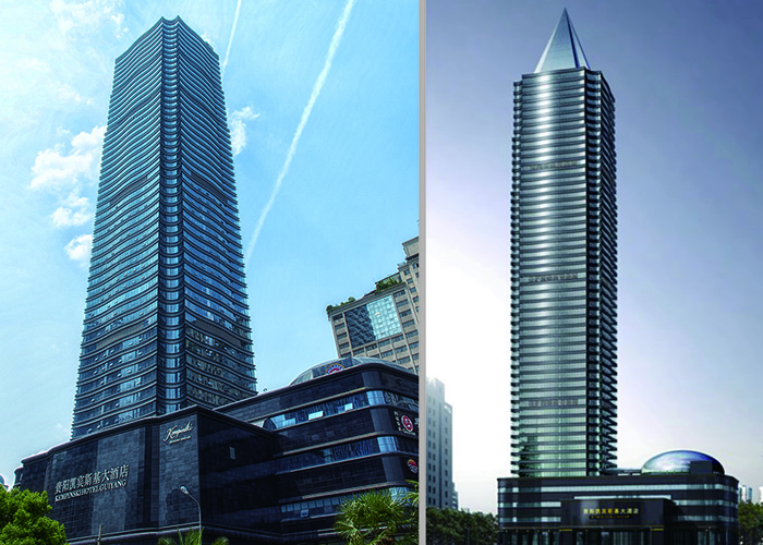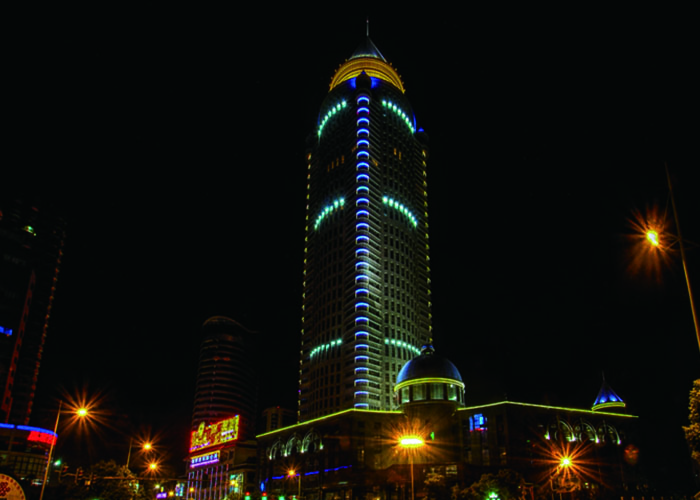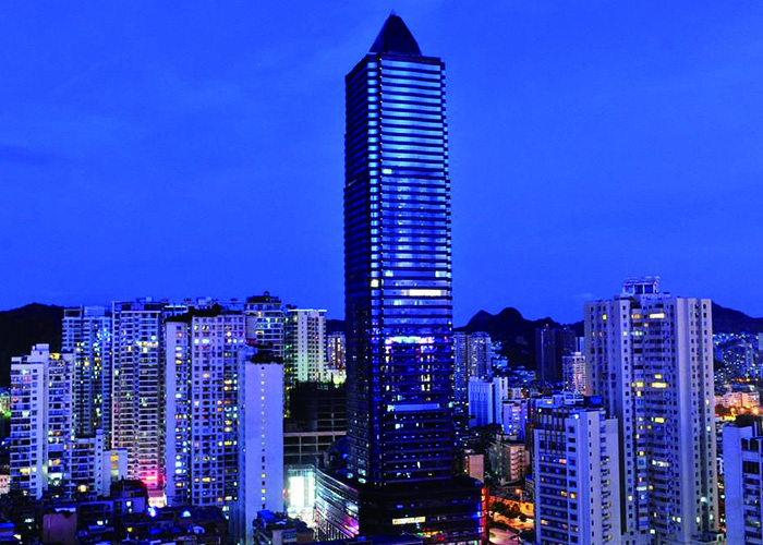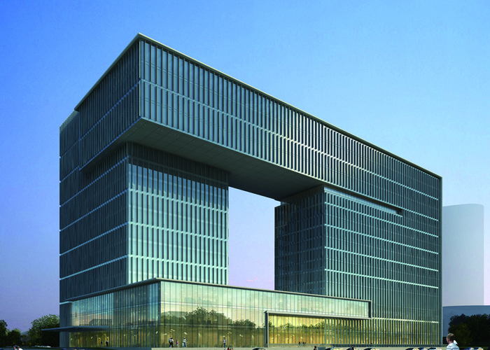 東景五星級酒店及辦公樓項目位于貴陽市觀山湖區,基地東鄰貴陽市行政中心,北鄰鋁鎂設計院,南鄰貴州移動指揮調度中心,西向陽森房產,地塊基本呈矩形,項目總用地面積24966平方米,總建筑面積99284平方米,其中地下建筑面積41915平方米。地上建筑面積共57369平方米,地下部分共計4層,為停車庫及酒店配套用房。地上部分由一棟結構總高64.4m的14層辦公樓和一棟結構總高68.8m的16層酒店組成,兩棟塔樓平面呈L型布置,結構形式均為現澆框架剪力墻結構,辦公樓頂部采用鋼結構向外懸挑兩層,懸挑跨度為11.1m。辦公樓和酒店在頂部通過跨度為30m鋼結構連接體相連,連接體在辦公樓側與混凝土柱鉸接相連,在酒店一側用滑移支座相連,滑移支座接罕遇地震下兩座單體最不利彈性位移進行設計,保證兩個單體在罕遇地震下不致相撞或脫開。